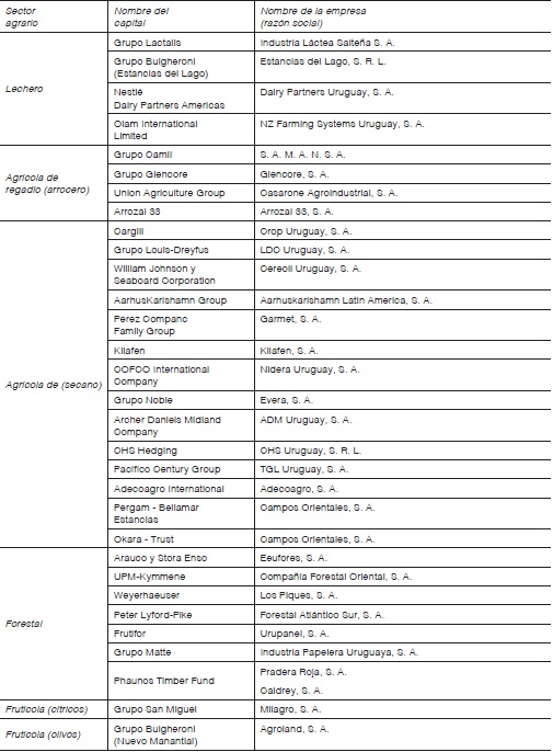 Si se compara la anterior información de la posesión de tierras por empresas extranjeras en Uruguay, el dato de esta investigación no coincide, en primer lugar porque el mercado de este tipo de transacciones es muy dinámico, y en segundo porque las metodologías de recopilación son muy dispares por la escasa información que existe. Lo importante es que ambos estudios intentan aproximarse de forma precisa a un fenómeno global y creciente en los últimos años, en los cuales Uruguay ha sido sumamente afectado. La acumulación de datos y estudios referentes a esta temática ayuda a visualizarla y a tener elementos para el debate, pues para el Estado es un fenómeno “natural” y no es necesario un control que evite la concentración del capital y de la tierra.