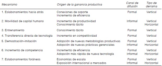 Las derramas de conocimiento se dan por diversos medios. Monge-González, Leiva & Alegre (2011) han identificado que, para las EMN establecidas en Costa Rica, ello sucede a través de tres vías: 1) demostración, 2) encadenamientos verticales y 3) movilidad laboral. Los mismos autores afirman que las del primer tipo incluyen la imitación, o ingeniería inversa por parte de empresas locales. Las segundas aluden a los eslabonamientos verticales, ya sea hacia delante o hacia atrás con las EMN, y el tercer caso se refiere a la transferencia y aplicación de conocimiento a empresas locales por parte de exempleados de las EMN (Monge-González, Leiva & Alegre, 2011: p. 10).
