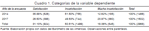 El análisis estará enfocado en las categorías que miden la insatisfacción con la democracia. Con ese propósito, las opciones “Mucha satisfacción” y “Satisfacción” se agruparon en una sola categoría, debido al bajo número de observaciones registradas en “Mucha satisfacción”: 2.25% (n=33) en 2014 y 3.46% (n=52) en 2017. El Cuadro 1 presenta una desagregación por año de las categorías de la variable utilizada en el análisis.