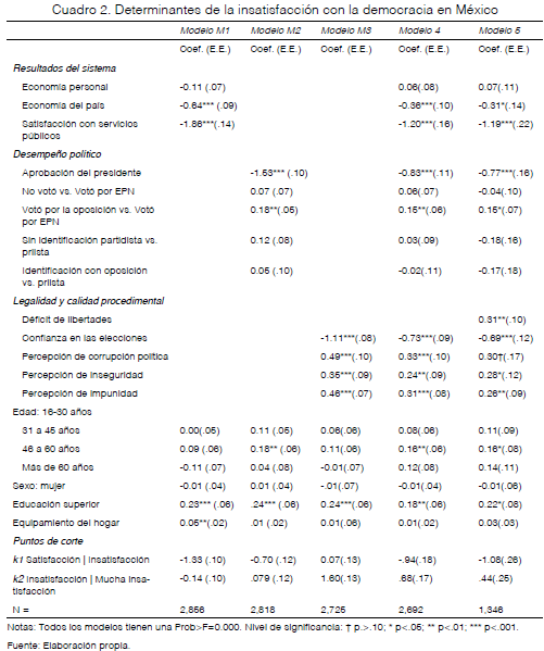 De esta forma, este análisis contribuye al investigar los determinantes de la satisfacción con la democracia en democracias emergentes. En particular, proporciona evidencia que muestra que los ciudadanos le dan una importancia sustancial a la calidad del gobierno y los procedimientos democráticos, en especial en sistemas políticos que padecen deficiencias en esos rubros. Estos resultados permiten tener una comprensión más amplia del fenómeno de la insatisfacción política en democracias emergentes que los hallazgos de Dahlberg, Linde & Holmberg (2015), quienes encuentran que los resultados del sistema son mucho más importantes que la calidad de los procesos políticos para los ciudadanos en las democracias nuevas. Aquí se muestra que, en México, la evaluación de los resultados del sistema es determinante pero insuficiente para ofrecer una explicación integral de la insatisfacción con la democracia en este país.
