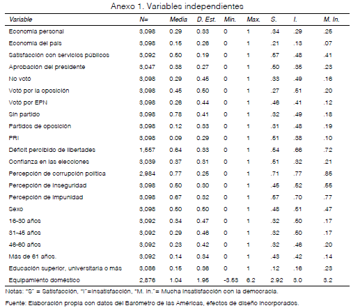 El contexto en el que se levantaron las encuestas sugiere que la población mexicana tenía una percepción negativa del estado de la economía del país. Con la finalidad de captar estas actitudes, el análisis recurre a dos variables. La primera, situación económica del país, se mide con el reactivo SOCT2: “¿Considera usted que la situación económica del país es mejor, igual o peor que hace doce meses?” La segunda variable es la situación económica personal que responde al reactivo idio2: “¿Considera usted que su situación económica actual es mejor, igual o peor que la de hace doce meses?” Adicionalmente a la evaluación de la economía, se incluye la variable satisfacción con servicios públicos, que mide la percepción de la calidad de los servicios de salud pública, educación y el estado de autopistas y carreteras. Esta variable es un índice aditivo de tres reactivos (SD2NEW2, SD3NEW2 y SD6NEW2) que preguntan, respectivamente, por la satisfacción con cada uno de esos bienes públicos.6 Este índice pretende evaluar el efecto de la calidad percibida en los bienes públicos proporcionados por el sistema político. Las tres variables de este bloque fueron recodificadas para que adopten valores de 0 a 1, donde 0 indica el nivel más bajo de la variable y 1 el más alto.