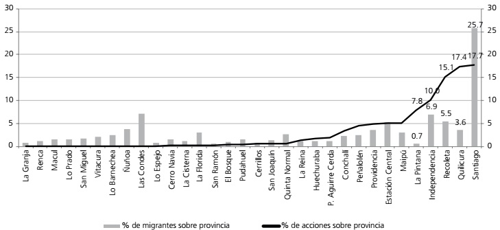 Mientras que los cinco municipios que más acciones han llevado a cabo, Santiago,4 Quilicura, Recoleta, Independencia y La Pintana, concentran proporciones muy diferentes de migrantes, y sin embargo han definido orientaciones institucionales creando programas u oficinas focalizadas en su atención. Esto otorga a las decisiones políticas dentro del municipio un papel más relevante que la concentración de migrantes al momento de impulsar acciones dirigidas a esta población.