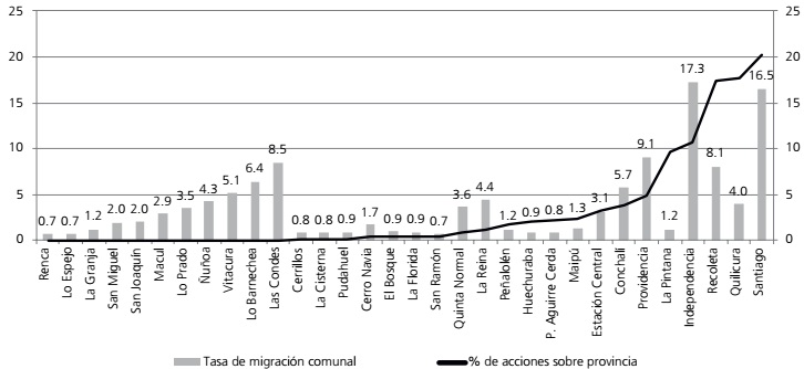 Algo similar se observa al contrastar la actividad de las municipalidades con la tasa de migración comunal. En el Gráfico 2 se aprecia que comunas con una similar proporción de migrantes sobre el total de la población muestran niveles de actividad distintos.5 Santiago o Independencia, comunas con tasas de migración del 27.8 y 30.2%, realizan respectivamente el 17.7 y el 10% de las acciones de la Provincia. Lo opuesto ocurre con Providencia, Estación Central, Recoleta, Quinta Normal, Las Condes o Vitacura, las seis con tasas de migración de entre el 11 y el 15%, muestran un nivel de actividad muy disímil en la materia. Pero mientras Recoleta, Quinta Normal y Estación Central son comunas cuya población tiene un nivel de ingreso medio bajo, Las Condes, Vitacura y Providencia se encuentran entre las cinco más ricas del país. En la misma línea, las comunas de Ñuñoa, Lo Barnechea, La Reina y Quilicura, que cuentan con una tasa de entre el 6 y el 10%, tienen un nivel de actividad muy desigual. Mientras que en las tres primeras no se registró ninguna acción y una muy baja actividad en la tercera, la última es la segunda más activa de la provincia.