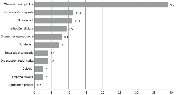 Un papel secundario ha jugado en esta línea institucional el problema de la relación entre las agencias del Estado y la sociedad civil (Ortiz, 2009; Fauser, 2008), la cual se ha abordado principalmente en Argentina y España. En el primero de estos países, los gobiernos locales y subnacionales son estudiados como uno más entre otros actores con los que las organizaciones de y pro migrantes establecen relaciones en las luchas por el reconocimiento de determinados derechos (Caggiano, 2004, 2006; Canelo, 2011; Gallinati, 2015). En España, entre tanto, los trabajos se han concentrado en los procesos de articulación entre el asociacionismo migrante y la institucionalidad local (Mancusí, Lacomba & Albert, 2013), y en los mecanismos de gobernanza participativa generados en el desarrollo de las políticas migratorias locales (Fauser, 2008; Aboussi et al., 2013).