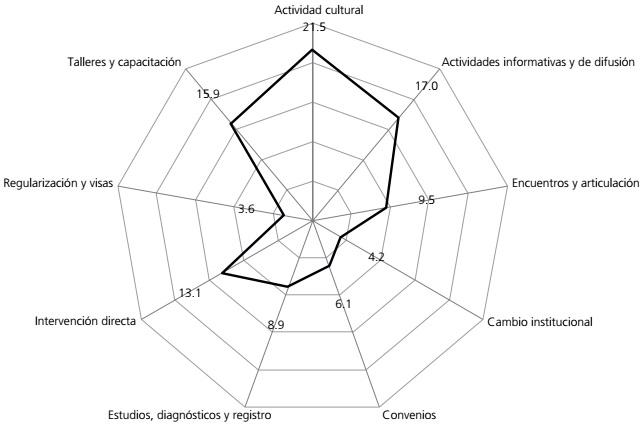 Sobre la naturaleza de las acciones, se observa que el 21.5% del total corresponde a “actividades culturales” (conmemoración de festividades nacionales o religiosas, ferias costumbristas, carnavales, festivales musicales, entre otras). Las siguen las “actividades informativas” (campañas, seminarios, coloquios, etc.) y “talleres y capacitaciones” con el 17 y 15.9% del total de acciones, respectivamente. Las “intervenciones directas” y los “estudios y diagnósticos” concentran por su parte y siguiendo ese orden al 13.1 y al 8.9% de las acciones. En las primeras se incluyen acciones como la mediación en conflictos o la incorporación de traductores en los consultorios de atención de salud. Finalmente, acciones orientadas a incentivar procesos de regularización o cambios institucionales dentro de los municipios, que pueden tener una alta incidencia en las trayectorias migratorias, concitan en torno al 3.6% de las acciones (Gráfico 7).