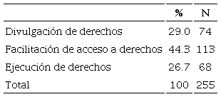 En cuanto a la naturaleza de las acciones de derechos, el 44.3% de ellas está orientado a facilitar el acceso a derechos, el 29% a divulgarlos y el 26.7% a su ejecución directa (Tabla 1). Entre las primeras se encuentran por ejemplo las intervenciones en consultorios con traductores que facilitan el acceso al derecho a la salud, o las capacitaciones de funcionarios en materia de derechos de la población migrante. Entre las segundas se agrupan acciones que informan a la comunidad migrante sobre sus derechos, mientras que entre las terceras se encuentran intervenciones como regularizaciones, enseñanza del español a migrantes no hispanoparlantes, entrega de visas de estudios, o gestiones para garantizar el acceso a la vivienda.