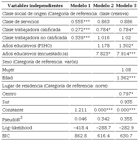 De este modo, se utilizó la técnica de análisis multivariado de regresión logística binomial, ensayándose tres modelos: el primero incorpora como variable independiente solo la posición de clase de origen; el segundo agrega dos variables cuantitativas que intentan expresar el papel del nivel educativo de origen y el alcanzado por el(a) encuestado(a),9 por último, el tercer modelo (el más completo) agrega las variables de sexo, edad y lugar de residencia del(a) encuestado(a). Para facilitar la lectura, los parámetros β son expresados en su forma exponencial, es decir, en razones de momios y estandarizados para los modelos 2 y 3, en los que se agregan variables con distintos niveles de medición.
