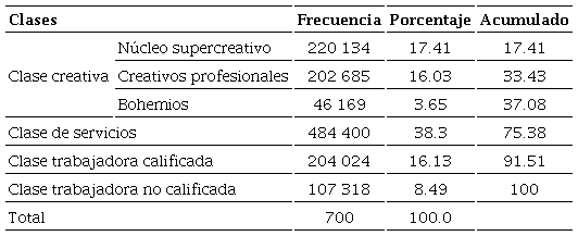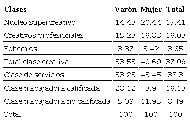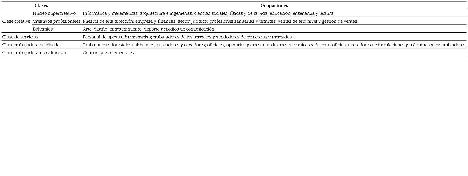 En relación con las ocupaciones creativas, Florida (2014) no habla de clase creativa como clase económica en términos de posesión de propiedades, capital o medios de producción, tal como podría abordarse desde perspectivas marxianas o weberianas. La clase creativa no posee ni controla la propiedad de los medios de producción en el sentido físico. En palabras de Florida (2014, p. 116), sus propiedades “proceden de su capacidad creativa, son intangibles, porque literalmente, están en sus cabezas”. Su delimitación está en proceso y viene dada por el tipo de trabajo que desarrollan sus miembros, el cual consiste en “crear nuevas formas significativas”. Según su definición, la clase creativa tiene dos componentes: a) núcleo supercreativo: científicos e ingenieros, profesores de universidad, poetas y escritores, artistas, animadores, actores, diseñadores y arquitectos, y líderes de pensamiento de la sociedad moderna, y b) profesionales creativos: sectores de alta tecnología, servicios financieros, profesiones legales y sanitarias, y gestión de las empresas. Por tanto, en el enfoque de Florida las clases sociales se explican como agrupamientos principalmente ocupacionales.