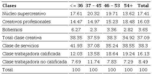 Al analizar la vinculación entre la estructura de clases y la estructura etaria (Cuadro 4), puede notarse que tanto la clase creativa como la clase de servicios agrupan a la población de mayor edad. Mientras que en el núcleo supercreativo, la población que adquiere mayor proporción es la del grupo de 30 a 53 años, los creativos profesionales, adquieren una mayor representación en el estrato más envejecido (mayores de 54 años). Los bohemios, en cambio, encuentran una mayor representación en el estrato más joven (30 a 36 años), si bien su participación en la clase creativa es ínfima.