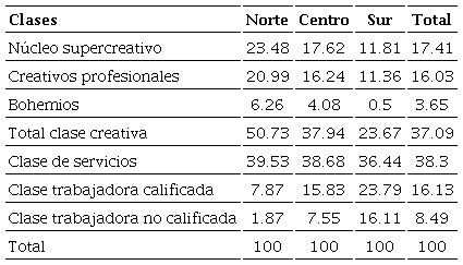 Al observar la estructura de clases de Buenos Aires, destaca que las ocupaciones creativas adquieren un peso y carácter central en su configuración. Internamente, el núcleo supercreativo presenta levemente mayores proporciones y las mujeres son las que ocupan en mayor medida dichas posiciones. En términos etarios, mientras que la población que se ubica sobre todo en el núcleo supercreativo presenta entre 37 y 53 años, los mayores de 54 adquieren mayor importancia en el estrato de creativos profesionales. Por otro lado, la ubicación geográfica de la clase creativa en la ciudad suele coincidir, en términos relativos, con la zona norte de la misma, en donde habitan principalmente los individuos de estratos socioeconómicos más elevados.