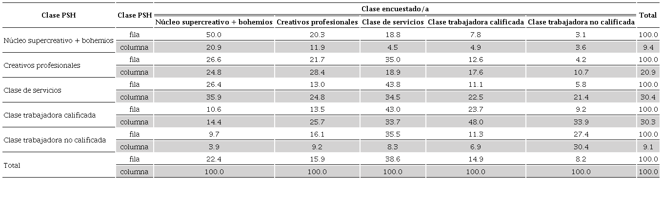 Una vez definida la herramienta de medición empírica es posible caracterizar la configuración de la estructura de clases de la CABA, haciendo énfasis en la clase creativa. En este sentido, considerando a la misma a partir de sus estratos constituyentes, puede verse en el Cuadro 2 cómo se distribuye la población ocupada mayor de treinta años en función de su posición social.