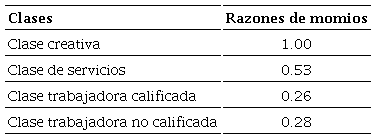 El presente estudio sobre la movilidad social en la clase creativa puede completarse con el análisis de la movilidad relativa, con el que se busca aislar el efecto producido por los cambios en los marginales de destino y origen de la tabla (totales de las columnas y las filas), es decir, por el cambio en el tamaño de las clases que puede estar vinculado a procesos demográficos, transformaciones económicas, etc. Para llevar adelante dicha tarea se calcularon las “razones de momios”, que comparan, por ejemplo, la probabilidad de que alguien con orígenes en la clase creativa pertenezca a dicha clase en vez de a la clase de servicios versus la probabilidad de que alguien con orígenes en la clase de servicios pertenezca a la clase creativa en lugar de su clase de origen. Como puede observarse, es una razón de razones. De esta forma, las razones de momios pueden tomar cualquier valor positivo, desde cero a infinito, significando un valor mayor a 1 que los momios de éxito son mayores en el grupo de contraste que en el de referencia, y viceversa cuando el valor es menor a 1.
