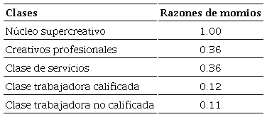 Vale aclarar que el esquema de clases propuesto por Florida, clasificación que le permite diferenciar a las ocupaciones consideradas creativas de aquellas que no lo son, no debe confundirse con el índice de creatividad anteriormente reseñado. La clasificación de las ocupaciones creativas conforma una de las variables que dan cuenta del “talento”, dimensión constituyente del índice.
