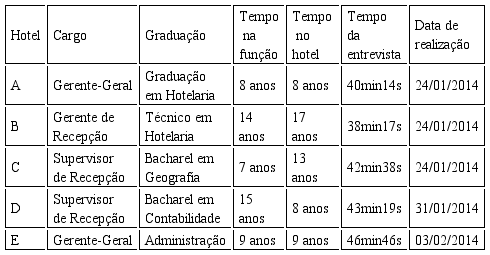 A coleta de dados se deu por meio da realização de entrevistas não estruturadas. As entrevistas se desenvolveram a partir de uma abordagem na qual os entrevistados eram levados a refletir sobre os conceitos de sustentabilidade e inovação nas operações de hotelaria e ponderar, com o auxílio das questões propostas, como o hotel que representavam se posicionava em relação às inovações sustentáveis. Utilizou-se um roteiro, aplicado a todos os entrevistados, contemplou questões sobre as práticas de inovação sustentável, buscando compreender como o hotel planeja e implementa ações de sustentabilidade, como as compartilha com seus stakeholders, de que maneira as divulga em projetos de marketing e como percebe os resultados dessas ações. As entrevistas foram realizadas com os gestores dos cinco hotéis pesquisados. Todas elas foram gravadas com a utilização de um gravador de voz digital e transcritas para posterior análise. Na sequência, as respostas foram analisadas e interpretadas à luz do referencial teórico construído sobre inovações sustentáveis no setor de turismo e hospitalidade. As cinco entrevistas foram gravadas e duraram, em média, 40 a 45 minutos. Dessa forma, para a análise, foram utilizadas mais de três horas de entrevista transcrita. No quadro abaixo (Quadro 01), estão descritas em detalhe a identificação e a caracterização dos entrevistados quanto ao gênero, cargo ocupado, formação, tempo na função e tempo no hotel, bem como a duração da entrevista e a sua data de realização.