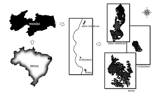 Os recifes de Picãozinho (07°06’15”S, 34°48’45”W), Seixas (07°09’08”S, 34°47’14”W) e o Parque Estadual Marinho de Areia Vermelha (07°00’41,95”S, 034°48’58,02”O) constituem formações recifais que, durante o período da maré baixa, exibem piscinas naturais contendo uma diversidade de organismos marinhos (MELO, 2006; BATISTA et al., 2009; LOURENÇO, 2010) (Figura 1).