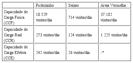 Outra limitação atrelada aos estudos de capacidade de carga desenvolvidos em Picãozinho, Seixas e Areia Vermelha se refere à dificuldade em identificar os impactos provocados especificamente pela atividade turística sobre o meio biológico e sua relação com o estabelecimento da capacidade de carga. Para Stankey et al. (1985), os estudos de CCREC não indicam a existência de relação direta entre número de visitantes e quantidade de impactos gerados, e estes estão muito mais ligados ao comportamento dos visitantes do que ao número de pessoas.