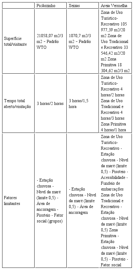 Este trabalho foi desenvolvido a partir de uma análise crítica dos estudos de capacidade de carga desenvolvidos nos recifes de Picãozinho, Seixas e Areia Vermelha e das metodologias para definir capacidade de suporte pela atividade turística.