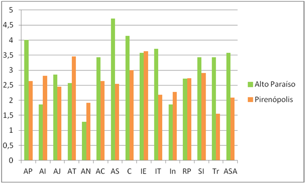 Os serviços prestados pelas instituições de suporte bem como seu grau de importância podem ser vistos no Gráfico 2. Em Alto Paraíso, os serviços que ganharam destaque em citações na pesquisa foram: aperfeiçoamento (AP), atividades comerciais (AC), atividades sociais (AS), convênios (C), infraestrutura para eventos (IE), serviço de informação (SI), treinamento (Tr) e ações de sustentabilidade ambiental (ASA). Já em Pirenópolis, foram: assessoria técnica (AT), convênios (C) e infraestrutura para eventos (IE). Convênio e infraestrutura para eventos foram citados por ambos. Tendo em vista que os convênios viabilizam benefícios a preços mais baixos e/ou podem consistir em acordos voluntários, esse resultado vai ao encontro da literatura.