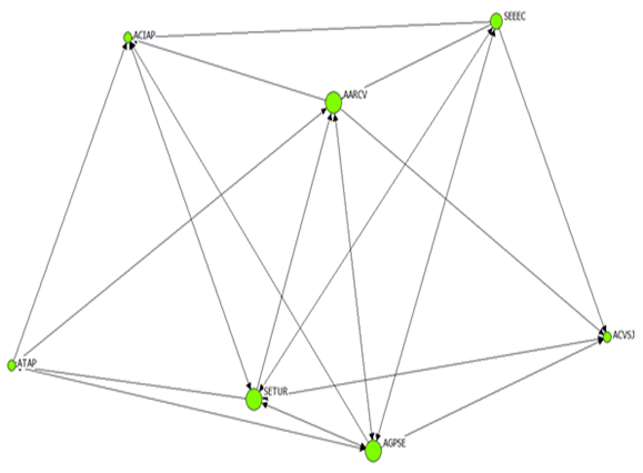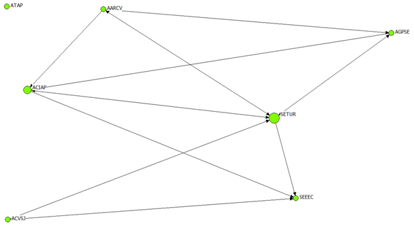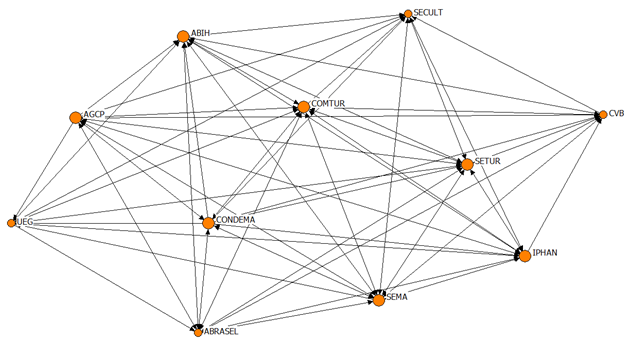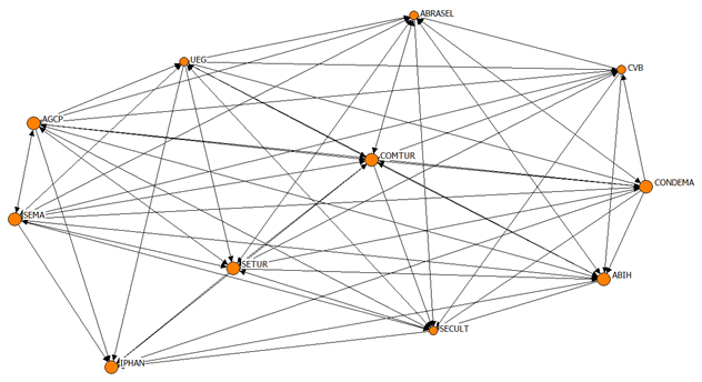 Nas Figuras 3 e 4 visualizam-se laços entre todas as instituições, e assim nenhuma instituição ficou isolada ou com número discrepante de relações, comparado às demais. Dessa forma, é possível afirmar que há relações de rede entre as instituições de suporte à atividade turística em Pirenópolis e esta é bem integrada, já que grande parte dos atores se relaciona de acordo com os índices de medida de rede encontrados.