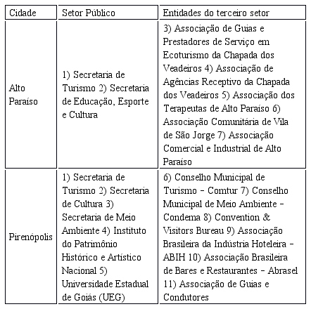 Os respondentes foram os dirigentes das instituições ou pessoa por eles indicada, com seleção realizada por meio de censo. As instituições de suporte à atividade turística de Alto Paraíso foram, inicialmente, identificadas por meio do sítio eletrônico da Prefeitura do Município, na página da Secretaria de Turismo. A lista de instituições de Pirenópolis foi fornecida pelo Conselho Municipal de Turismo (Comtur) e, a esta, foram acrescentadas instituições encontradas em sítios eletrônicos na internet. Em Alto Paraíso, foram localizadas sete instituições de suporte à atividade turística e, em Pirenópolis, 11, totalizando 18 instituições. Esse recorte delimitou o escopo do trabalho, porém, um estudo de campo posterior de Oliveira, Hoffmann e Costa (2013) demonstrou que existem outras instituições envolvidas com o turismo nas duas cidades. O Quadro 1 sintetiza a lista de participantes da pesquisa.
