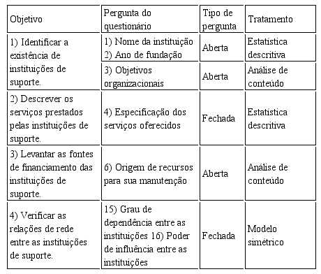 Para a realização desta pesquisa, foi utilizado o corte transversal. A coleta dos dados primários foi feita por meio de um questionário com 16 perguntas entre questões abertas e fechadas. Como esse trabalho derivou-se de uma recomendação do trabalho publicado por Hoffmann e Campos (2013), foi utilizado o mesmo instrumento daquele trabalho. As questões abertas caracterizam a instituição e as fechadas buscam identificar as relações de rede (Quadro 2) e os serviços de apoio realizados (Quadro 3).