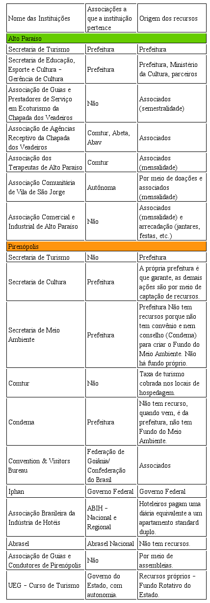 No litoral catarinense investigado por aqueles autores, a maioria das instituições é direta ou indiretamente financiada com recursos públicos. Conforme Dwyer e Kim (2003), o financiamento é um dos itens gerais de infraestrutura do turismo e, como notou Hassan (2000), a parceria entre governo e terceiro setor sustenta o ambiente e a demanda de mercado. Nos destinos pesquisados, essa parceria, se existe, é tênue, podendo representar um ponto de entrave ao desenvolvimento da competitividade dos destinos, à luz da literatura. Note-se que o trabalho de Bonet (2004) esclarece que Barcelona se tornou um destino turístico em função de se ter criado uma instituição responsável pela gestão do destino, com aporte financeiro e participação de todos os atores envolvidos, inclusive o governo. Ressalta-se que Bonet (2004) reitera o fato de a instituição de Barcelona ter fonte própria de recursos, em formato de uma taxa cobrada dos turistas por pernoite, algo que foi citado neste estudo somente pelo Comtur de Pirenópolis.