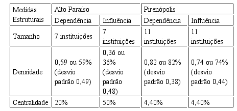 As medidas estruturais foram mensuradas em função do grau de dependência e do grau de influência entre as instituições de suporte à atividade turística das duas cidades. Na matriz de Alto Paraíso, o potencial de ligações existentes (GRANOVETTER, 1985) era de 42 (6x7). Quanto à dependência (Figura 1 e Tabela 1), constatou-se um total de 25 relações entre as instituições, sendo que cerca de 59% dos relacionamentos são efetivados. Com relação à influência (Figura 2 e Tabela 1), 15 relações foram apontadas, mostrando que cerca de 36% dos possíveis relacionamentos acontecem. Na matriz de Pirenópolis, o potencial de relacionamentos era de 110 (11x10). Com relação à dependência (Figura 3 e Tabela 1), aproximadamente 82% dos relacionamentos são concretizados. Quanto à influência (Figura 4 e Tabela 1), foi identificada a existência de 74% das relações possíveis.