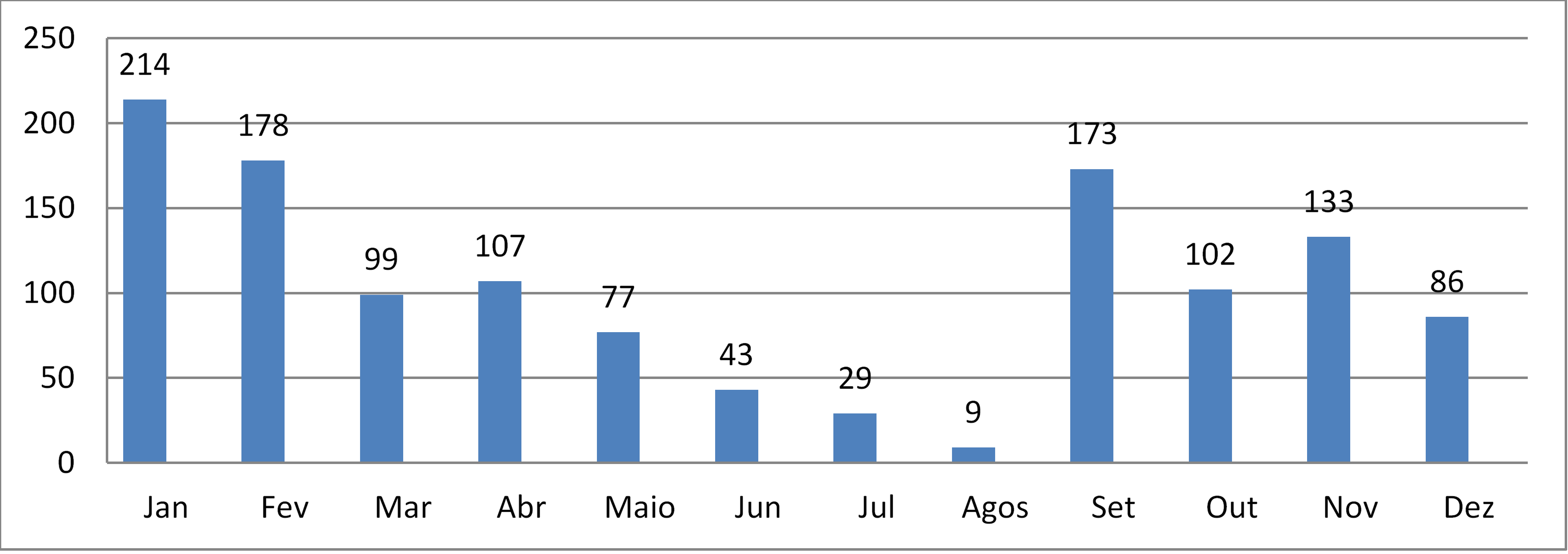 A análise do gráfico de ocorrências de desastres por região demonstra que a região Sul é a mais afetada por esse tipo de desastre, sendo o estado de Santa Catarina o mais afetado por esse fenômeno. No caso das inundações bruscas e alagamentos, são registrados a partir do aumento da precipitação, onde a vazão é ultrapassada e o escoamento da água fica comprometido. Assim, quando a quantidade de chuva é elevada, o nível dos rios aumenta, transpondo seus leitos. Dessa forma, a Figura 4 apresenta dados sobre a frequência mensal de inundação brusca no estado de Santa Catarina, no período de 1991 a 2010.