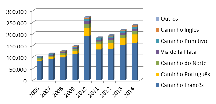 A Figura 3 demonstra que o número de peregrinos que se deslocam para Santiago de Compostela tem aumentado ao longo dos anos, não se considerando o ano de 2010 por ter sido Ano Santo e, naturalmente, os valores são diferentes, já que em anos de Jacobeu (quando o dia 25 de julho, Dia de Santiago, coincide com um domingo) o santuário de Santiago de Compostela tem uma afluência muito maior.