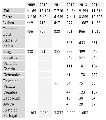 A Tabela 2 apresenta o número de peregrinos segundo o local onde iniciam a sua peregrinação até Santiago. De todos os locais apurados no relatório estatístico efetuado pelo Posto de Acolhimento ao Peregrino de Santiago de Compostela (quase 200), foram selecionadas apenas algumas cidades portuguesas onde os peregrinos iniciam o seu percurso através do Caminho Central Português, algumas ao sul do Porto, outras ao norte (e Tui, sendo espanhola, é também um importante ponto de partida e de passagem do Caminho Central Português).