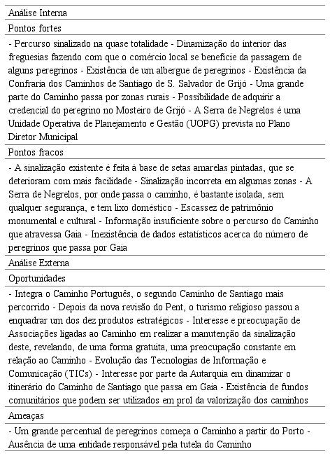 A análise que se segue foi realizada com o intuito de compreender os fatores que podem influenciar a dinamização e implementação do Caminho de Santiago que passa por Gaia com base nas ameaças, pontos fortes, pontos fracos e oportunidades, e tendo em consideração o ambiente externo e interno a todo esse cenário. Pretende-se que a análise desses dados contribua para a elaboração da proposta de implementação e dinamização do Caminho de Santiago em Gaia, nomeadamente no que concerne à definição de ações estratégicas e operacionais.