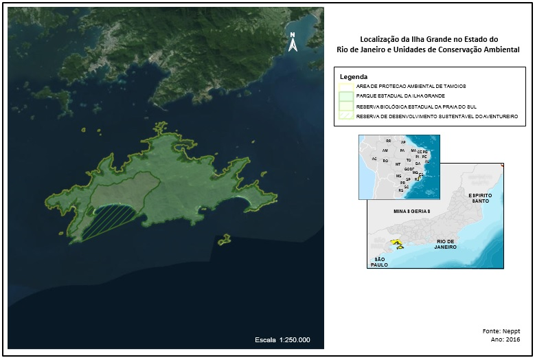 Localizada na Baía da Ilha Grande, litoral sul do estado do Rio de Janeiro, a Ilha Grande é distrito do município de Angra dos Reis e seu território encontra-se protegido por legislação ambiental (Figura 1).