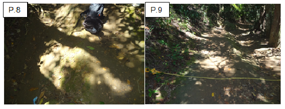 Os pontos P8 e P9 encontram-se relativamente próximos um do outro, no trecho mais plano da trilha. O ponto P8 tem largura de 3,10 m e apresenta 25 cm de profundidade no ponto mais erodido. Com vegetação arbórea, apresenta-se mais intacto em relação às outras trilhas do percurso (Quadro 1 e Figura 2).