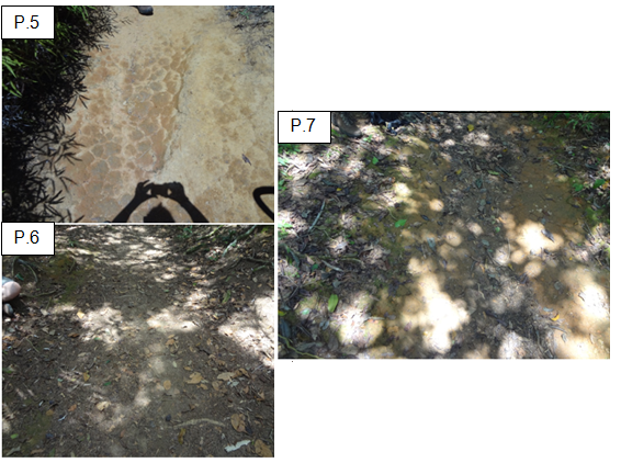 O ponto P6, localizado no trecho de descida da trilha, encontra-se em uma área relativamente plana, sem a presença de sulcos erosivos, raízes expostas ou marcas de pisoteio, com menos serrapilheira se comparada aos outros trechos aqui analisados. Com largura de 2,8 m apresenta 9 cm no ponto de maior profundidade desse perfil. Nesse ponto a vegetação é de médio porte com presença de clareiras.