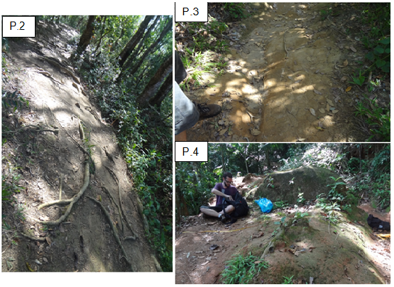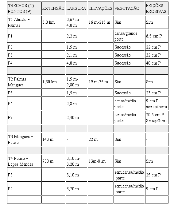 O ponto P1 foi marcado na subida da trilha, onde a mata encontra-se densa, composta de indivíduos antigos e de grande porte, com presença de cipós. A erosão no local chega no máximo a 6,5 cm de profundidade. O ponto P2 foi marcado no início da descida da trilha, onde a mata apresenta indivíduos antigos e jovens, com diferentes estágios de sucessão vegetal. A largura da trilha nesse ponto é de 2,1 m e a presença de raízes expostas e sulcos aponta um solo bem erodido, com 22 cm de profundidade. O ponto P3 foi marcado na descida da trilha em direção à enseada de Palmas. Neste, o solo aparenta estar bem compactado, com a presença de sulcos e 32 cm de profundidade de erosão. O ponto P4 foi marcado bem próximo à enseada de Palmas. Neste, a largura da trilha é de 4,0 m e apresenta erosão do solo de 40 cm de profundidade. Os sulcos erosivos estão sendo cobertos por vegetação e a presença de indivíduos jovens na borda da trilha chamou atenção. Registrou-se a presença de blocos de rochas no meio da trilha.