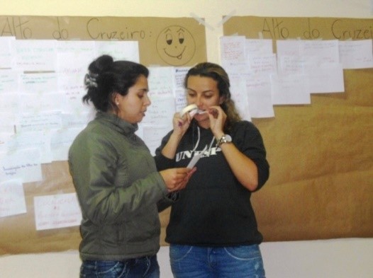 A metodologia adotada pelas autoras atuou em conformidade com as ideias de Paulo Freire (1983), que considera tarefa fundamental do “educador/extensionista”, educar e educar-se. Não cabe, nessa perspectiva, a postura unilateral de transmissão do conhecimento, mas, sim, a valorização de uma construção dialógica, que permita a troca e valorize as diferentes formas de conhecimentos. Acreditamos que com o uso de abordagens baseadas em metodologias participativas garantimos a existência de relações mais humanizadas, com a alteração necessária na postura do educador/mediador, o qual garante que o grupo social envolvido na proposta tenha um papel ativo durante todo o processo de reflexão. Obviamente, não defendemos que o educador/mediador seja alguém neutro durante esse processo. O principal ponto reside na capacidade de construção coletiva em um ambiente de troca de conhecimentos, a qual se, por um lado, não impõe formatos “corretos” aos interessados, por outro, informa-os e dialoga com eles sobre as possibilidades existentes. Assim, como esclarece Brandão (1999), nessa perspectiva surge a necessidade da participação do outro para construção do resultado.