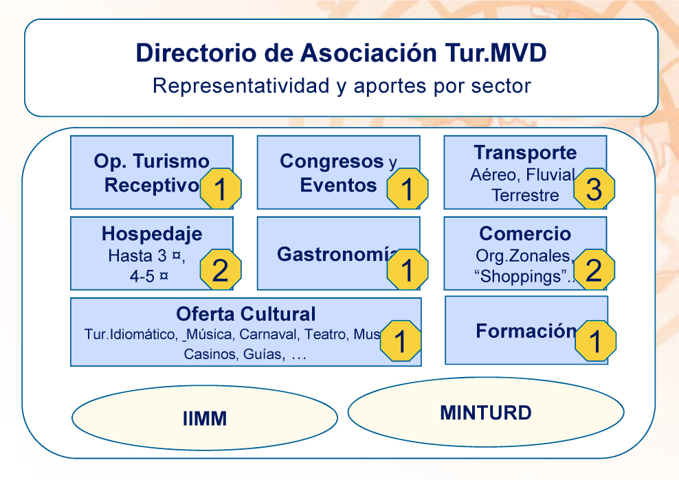 De este modo se conforma una nueva alianza estratégica de carácter público-privada, en la cual se define un plan estratégico para Montevideo y se plantean líneas de acción para la ejecución del mismo. Se define como. “es un espacio de encuentro, coordinación, planificación y ejecución de acciones estratégicas, entre actores públicos y privados organizados, con el objetivo de mejorar la competitividad turística de la ciudad”[6].