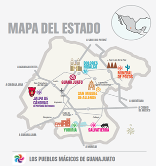 Es importante mencionar que cinco de los 111 Pueblos Mágicos se encuentran en el Estado de Guanajuato (ver Mapa 1). En orden cronológico estos son:Dolores Hidalgo, nombrado en 2002, y Jalpa de Cánovas, Mineral de Pozos, Salvatierra y Yuriria, nombrados en 2012.De estos destinos se puede mencionar que solo Dolores Hidalgo es una comunidad con antecedentes turísticos, siendo “Cuna de la IndependenciaNacional”, un productor reconocido de artesanías de cerámica y el lugar natalicio de uno de los cantantes más emblemáticos del género de música “ranchera”, además de ubicarse sobre la “Ruta de la Independencia” que pasa por la Sierra de Guanajuato y conecta a Guanajuato Capital conSan Miguel de Allende, uno de los destinos emblemáticos del Estado. Por otro lado, Mineral de Pozos, un pueblo minero abandonado y recientemente repoblado, cuenta con cierto encanto y representa un destino turístico en formación, mientras que el resto de los destinosestán en proceso de construirsu oferta turística. Los casos de Jalpa de Cánovas, Salvatierra y Yuriria merecen un análisis aparte pues estas comunidades recién comienzan a experimentar el desarrollo turístico y hay pocos antecedentes locales sobre la dinámica de esta actividad.