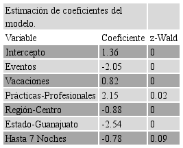 Para el análisis de la información contenida en la base de datos, se aplicó un modelo de regresión logística binomial. El trabajo de Hosmer eLemeshow (2013) expone sistemáticamente los alcances y aplicaciones del modelo. Para los propósitos de este documento, basta decir que el modelo de regresión logística se escogió por su capacidad para predecir la probabilidad de movilidad tomando en cuenta un conjunto de factores relacionados al perfil del visitante así como su comportamiento de viaje.