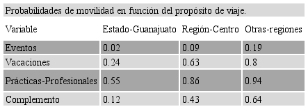 A partir de los datos de la Tabla 5, se puede pronosticar que si el origen del visitante es el Estado de Guanajuato y el propósito del viaje es “prácticas profesionales”, la movilidad tiene una probabilidad de 0.55. Quien visita Guanajuato con motivo de “vacaciones” o de “prácticas profesionales” y proviene de la región centro del país, entonces tiene una alta probabilidad (0.63 y 0.86, respectivamente) de visitar más de un destino en su viaje. Si la región de origen es fuera del Estado de Guanajuato o del centro del país, entonces se pronostica un alto nivel de movilidad, con excepción única de que el propósito del viaje sea por “eventos” pues en este caso la probabilidad de movilidad es de 0.19.