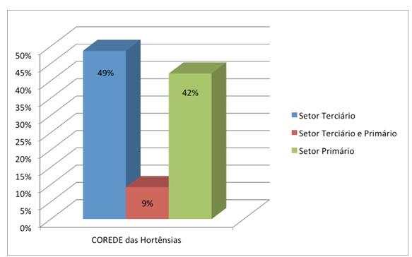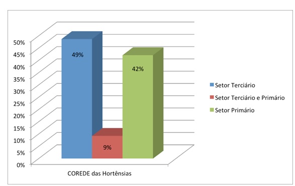 Na Figura 1, pode-se observar que o setor que mais emprega no Corede das Hortênsias, nas propriedades rurais ativas, em relação à atividade turística, é o setor terciário com quase 49% das vagas, somado aos trabalhadores que possuem jornada dupla e atuam tanto no setor primário quanto no terciário, chegando-se a 58% dos empregos. Esse dado aponta para a especialização do turismo rural na região e corrobora a hipótese de que o turismo é uma alternativa na geração de emprego e renda nas áreas rurais dos municípios visitados.