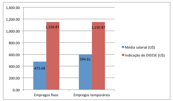 Pode-se observar na Figura 3 a média salarial dos trabalhadores das propriedades estudadas. Foi realizado um comparativo desses valores com o Departamento Intersindical de Estudos Econômicos, Sociais e Estatísticos (DIEESE, 2015) no mês em que as entrevistas foram realizadas a fim de se estabelecer um critério de análise dos salários praticados na região. Cabe salientar que os valores são expressos em dólares por ser um indexador mais durador, para isso, a conversão foi feita a partir de dados retirados da “web page” do Banco do Brasil, cuja média anual (2014) do dólar foi de R$ 2,54.