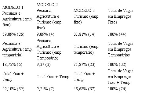 No modelo 3, observou-se um volume muito grande de vagas temporárias geradas pelo turismo, isso ocorre pela falta de vínculo empregatício, visto que os proprietários rurais ainda reclamam da sazonalidade da atividade turística. Percebeu-se nas entrevistas que esses trabalhadores são chamados nos períodos de alta temporada ou quando há necessidade de mais mão de obra. Ainda no modelo três, individuou-se que o turismo ainda gera poucos empregos fixos, mesmo que a atividade exercida na região seja, em sua absoluta maioria, o turismo rural.