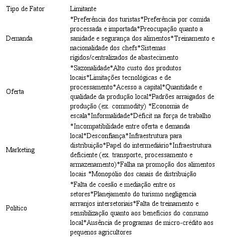 Apesar das potenciais sinergias entre turismo e agricultura, estudos de caso realizados ao redor do mundo mostram que esses arranjos multisetoriais são geralmente precários e que o consumo local de alimentos pelo trade turístico tem sido limitado (RHINEY, 2011; BERNO, 2011; RUEEGG, 2009; MEYER, 2007; MEYER, 2006; TORRES; MOMSEN, 2004). Esses estudos têm mapeado quatro tipos de fatores relacionados a demanda, oferta, marketing e política de alimentos (Quadro 1), os quais buscam explicar quais variáveis afetam o arranjo intersetorial em cada destino.