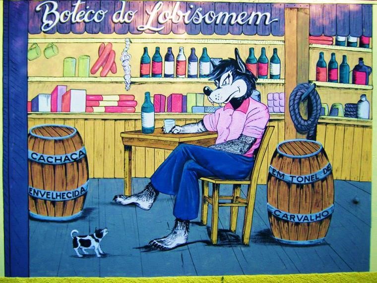 O Botequim dispõe de rótulos, decoração, pintura, miniaturas e outros objetos que fazem referência ao Lobisomem (Figura 2), bem como explana Wilson sobre a cachaça mais conhecida, a Língua do Lobisomem: