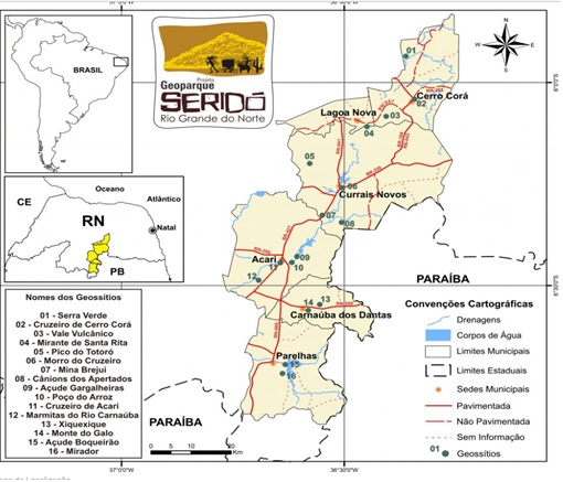 O Geoparque Seridó está localizado na porção centro sul do estado do Rio Grande do Norte, envolvendo seis municípios: Cerro Corá, Lagoa Nova, Currais Novos, Acari, Carnaúba dos Dantas e Parelhas. A proposta contempla 16 geossítios conforme ilustra a Figura 1 a seguir.