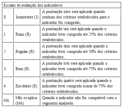 A avaliação dos indicadores seguiu uma escala de 0 a 4, conforme apresentada no quadro a seguir: