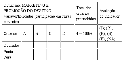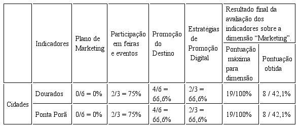 O Quadro 04 apresenta os resultados gerais referentes à dimensão marketing e promoção do destino dos municípios de Dourados e Ponta Porã em Mato Grosso do Sul. Para o indicador plano de marketing foram considerados: sua existência ou não; indicadores de desempenho; tempo de duração; acompanhamento por parte dos gestores; existência de banco de dados e orçamento para execução das ações. Para o indicador participação em feiras e eventos, considerou-se: existência de uma política formalizada de participação em eventos, produção de algum evento promocional nos últimos cinco anos e que tipo de ação o município realiza para medir o desempenho nesse tipo de atividade. Para o indicador promoção do destino as variáveis foram: a existência de material promocional, clareza, mais de um idioma, existência de mapas, preocupação com o meio ambiente e com a exploração sexual de menores. Por fim, o indicador estratégia de promoção digital, o qual considerou: existência de página na Internet com informações turísticas, atualidade das informações e possibilidade de outro idioma.