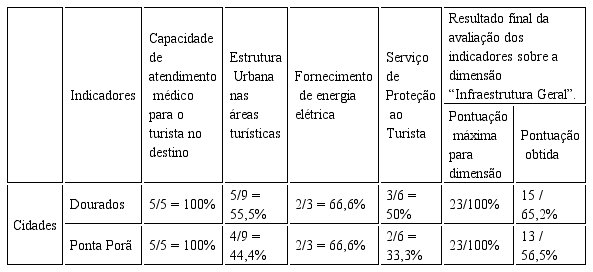 Neste capítulo foram apresentados, analisados e discutidos, a partir do referencial teórico, os elementos principais de investigação da pesquisa. O quadro a seguir apresenta os resultados gerais referentes à dimensão infraestrutura geral dos municípios de Dourados e Ponta Porã em Mato Grosso do Sul.