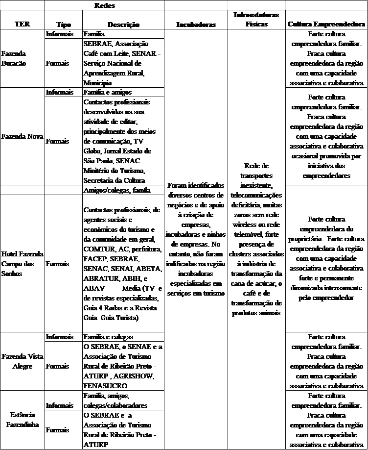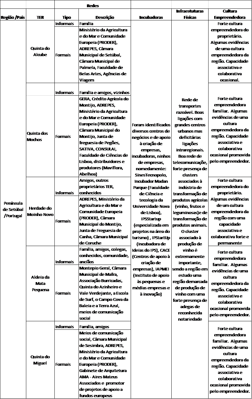 De forma a se identificar e compreender o ecossistema empreendedor promotor da geração e desenvolvimento da atividade TER, foi realizada uma análise de conteúdo das entrevistas realizadas nos empreendimentos de Turismo em Espaço Rural no Brasil, em Portugal e na Espanha e cuja síntese é apresentada nos quadros 4, 5 e 6 respectivamente (vide anexo 2). A análise de conteúdo possibilitou compreender e avaliar as redes, infraestruturas relevantes para a geração e desenvolvimento da atividade empreendedora TER, assim como identificar a existência de uma cultura empreendedora por parte dos stakeholders envolvidos na atividade.